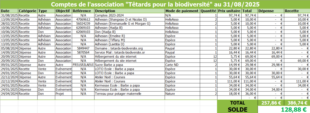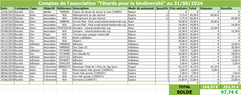 Nous vous invitons à consulter les détails de nos comptes ci-dessous. N’hésitez pas à nous contacter si vous avez des questions ou des suggestions. Votre soutien et votre confiance sont essentiels pour continuer à faire de « Têtards pour la Biodiversité » une force positive au sein de notre communauté.